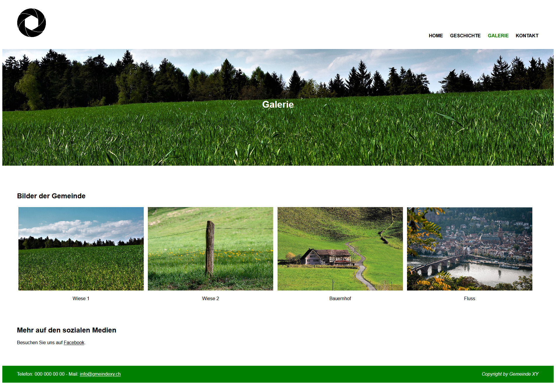 Füge nach dem Titel «Bilder der Gemeinde» die Bildergalerie ein – aussehen gemäss Screenshot. Skizziere zuerst von Hand wie du die Bildergalerie aufbauen willst. Tipp: Arbeite mit verschiedenen DIVs!