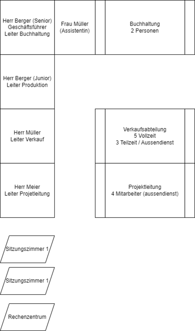 Sämtliche anderen Mitarbeiter arbeiten jeweils in ihren Gruppen gemeinsam in einem eigenen Büro. In der Buchhaltung arbeiten 2 Mitarbeiter im Vollzeitbetrieb. In der Verkaufsabteilung arbeiten 5 Mitarbeiter im Vollzeitbetrieb und zusätzlich noch 3 Mitarbeiter im Teilzeitbereich, bzw. im Aussendienst. In der Projektleitung arbeiten 4 Mitarbeiter, welche meistens ausser Haus am Arbeiten sind. Es sind 2 Sitzungszimmer geplant und die Informatik bekommt einen eigenen Raum im Keller mit genügend Platz. Es gilt keine physische Zutrittskontrolle zu den Räumen zu implementieren. Diese Aufgabe wird mit einer anderen Firma realisiert. Herr Berger Senior möchte klare Kostenaufstellungen erhalten und Herr Berger Junior möchte eine Technische Lösung aufgezeigt bekommen, welche dem aktuellen Stand entspricht. Die Entscheidung für die Umsetzung des Konzeptes, liegt bei Herrn Berger Senior.